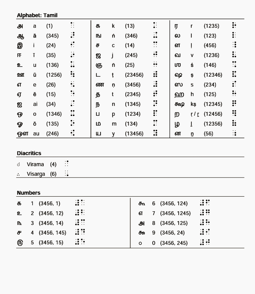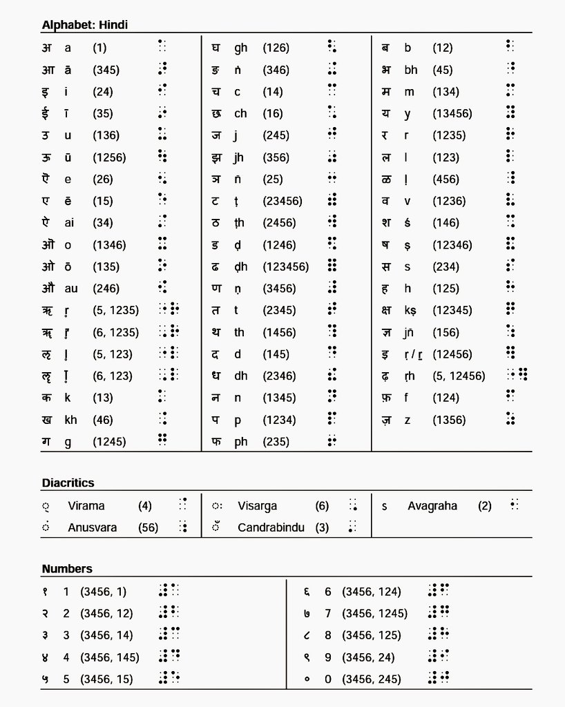 Bharati Braille [भारती ब्रेल] is a semi-unified system for Indian languages that enables blind & visually impaired people to read & write through touch. It is a linearized alpha-syllabary where each Braille character roughly represents an Indian grapheme.