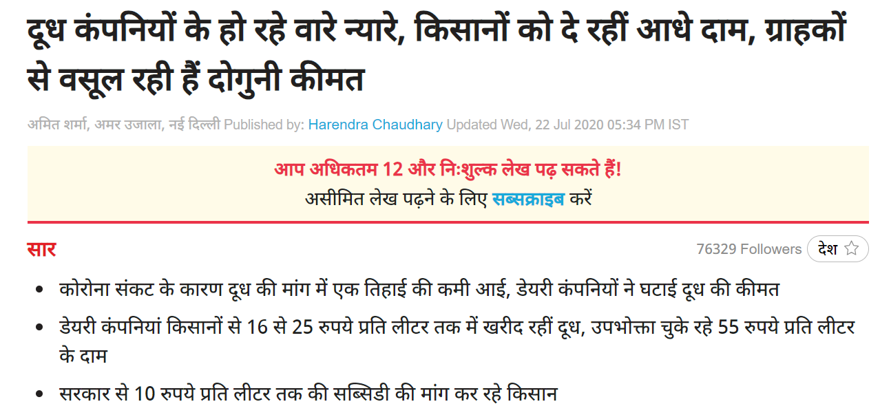 dūdh kãpniyo ke ho rahe vāre nyāre, kisānõ ko de rahī̃ ādhe dām, grāhkõ se vasūl rahī haĩ dogunī kīmat