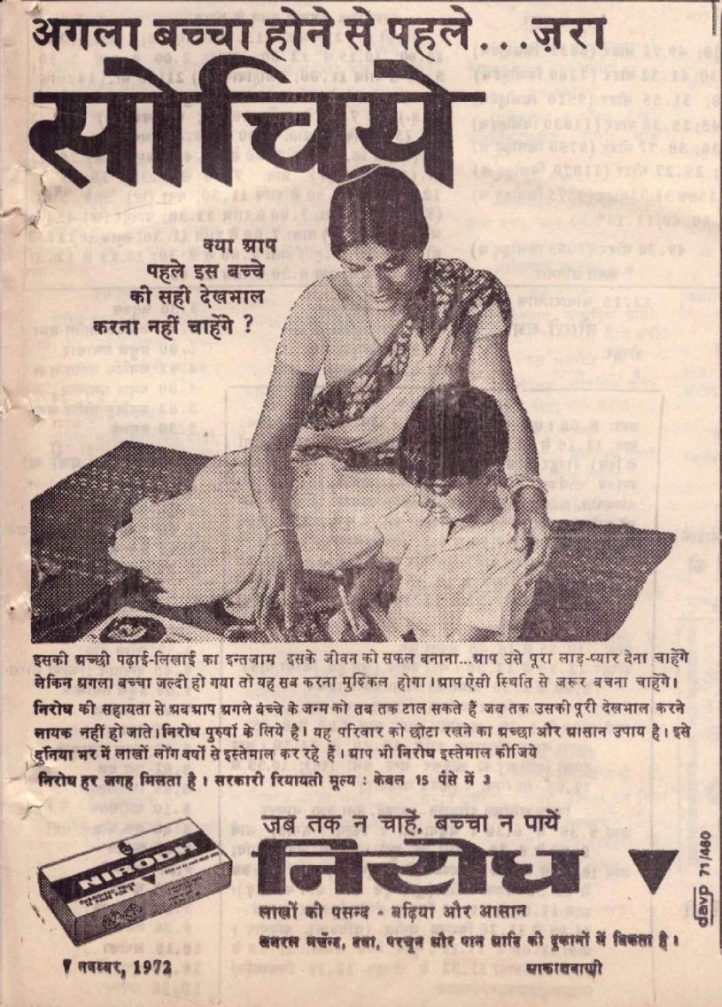 A condom campaign in India in the 1970s involved naming the contraceptive product Nirodh निरोध (from Sanskrit निरोधः nirodhaḥ Confinement, prohibition). Condoms had been known as “French letters” in English, and were considered a taboo word. Here is a Hindi print advertisement from 1972.