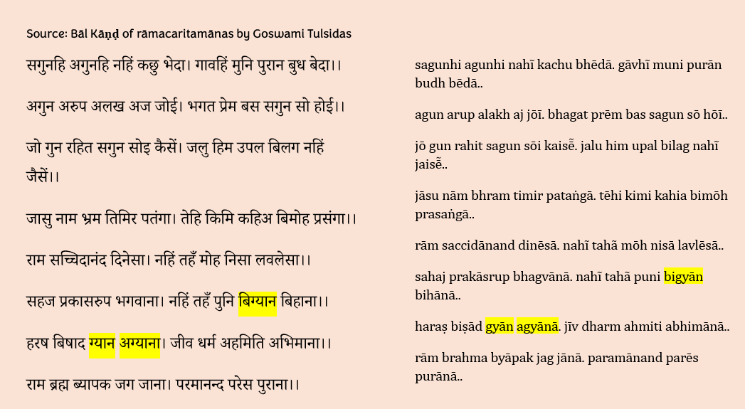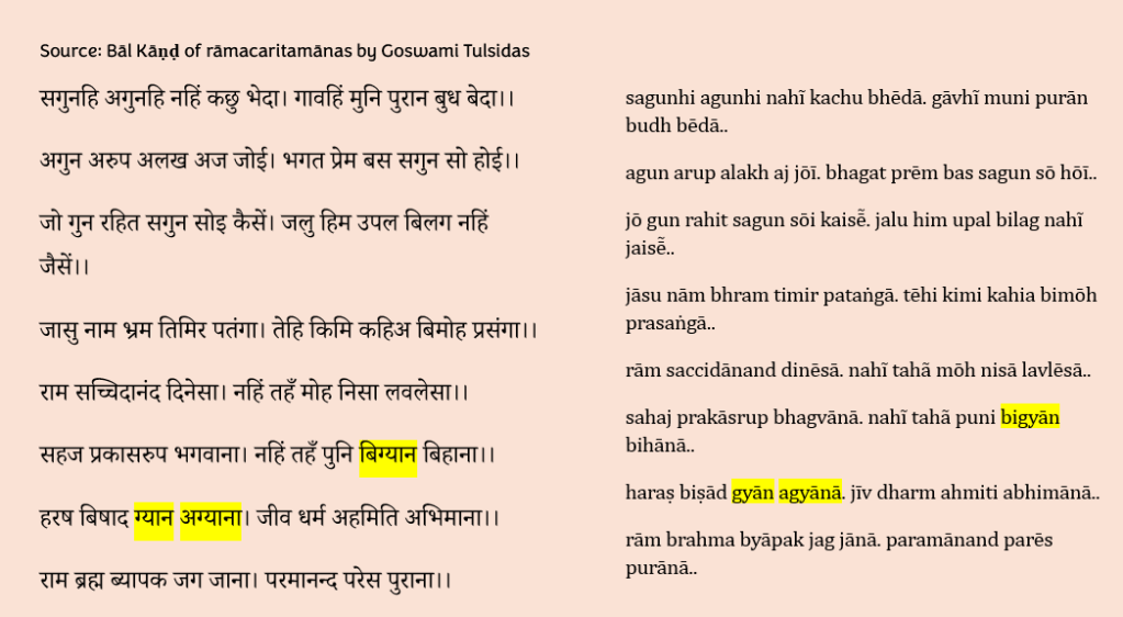By regular sound change, ज्ञान jñāna in New Indo-Aryan languages would be expected to develop into forms like नाण nāṇa, as preserved in Old Gujarati નાણ nāṇa (tadbhava). However, many Sanskrit words were later re-borrowed into New Indo-Aryan languages. Speakers, knowing the original conjunct ज्ञ jña, attempted to pronounce it according to the phonological rules of their own languages. As early as circa 16th century, Goswami Tulsidas was using the gya ग्य pronunciation of ज्ञ jña. See following example from his magnum opus – śrī rāmacaritamānas श्री रामचरितमानस (q.v.: Bāl Kāṇḍ i.e. Child episode):